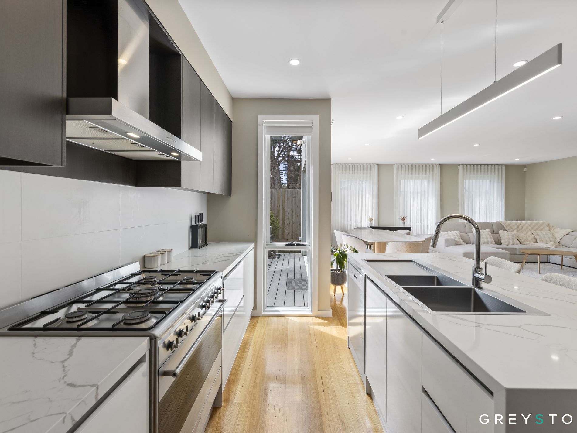 The heart of this home is an exquisite designer kitchen that effortlessly combines style and substance. Appointed with premium appliances, refined finishes and expansive bench space, it is a space where entertaining is elevated and daily living feels indulgent. Sophisticated flooring underpins the interiors with warmth and cohesion, while seamless heating and cooling ensure the home remains an oasis of comfort throughout every season.